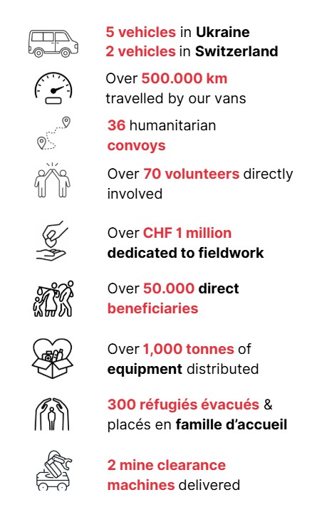 In the early days of the conflict, confronted with the horror of the situation, Dimitri and Alex Montanini decided to act. They made their company vehicles available, mobilized citizens, raised funds, and collected tons of essential goods. Just weeks after the outbreak of the war, the first convoys were deployed to distribute massive emergency aid. On the return journey, volunteer civilians were brought to Switzerland and hosted by willing families, offering temporary refuge. The scale of citizen mobilization quickly made it necessary to establish a formal structure, giving birth to Van For Life !Â